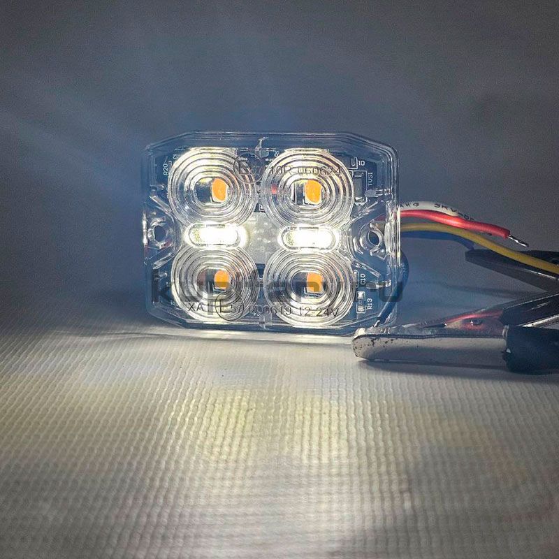 Главное преимущество модели — комбинированный свет: оранжевый стробоскоп + белая подсветка габарита. В обычном режиме светильник работает как аккуратный габаритный огонь, а при необходимости одним переключением активируется сигнальный строб. Это удобно, практично и экономит место на установке: вместо двух приборов — один.