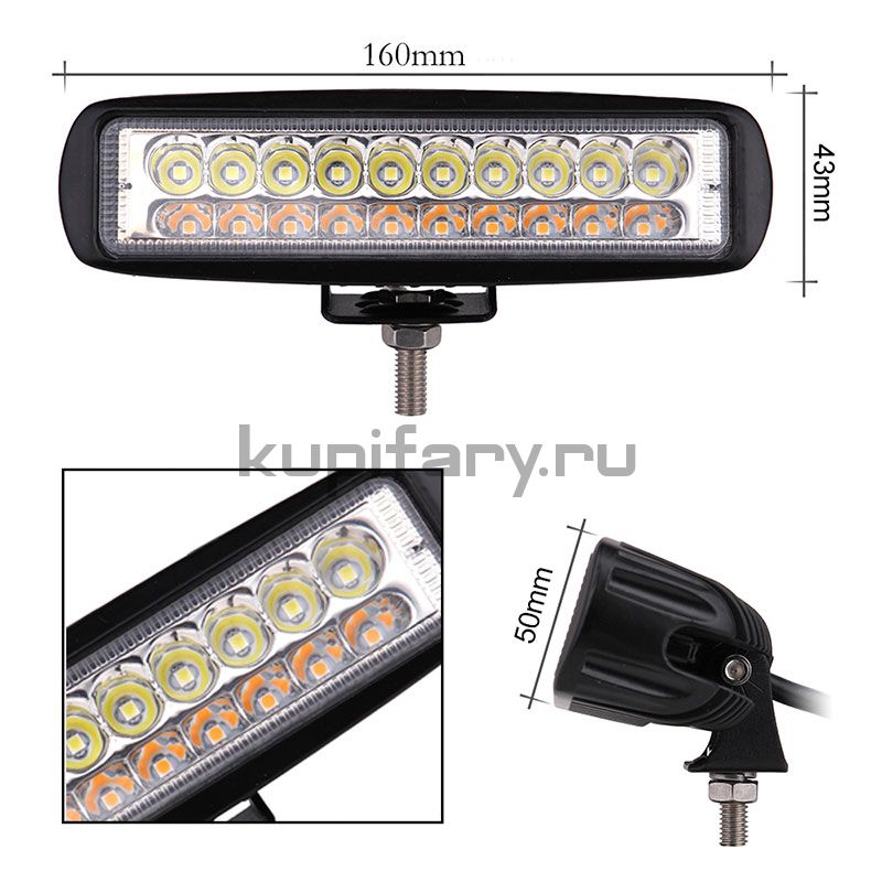 Универсальность этой фары заключается в ее способности излучать как желтый, так и белый свет. Желтый свет идеально подходит для использования в условиях тумана или пыли, так как он лучше проникает сквозь плохую видимость, в то время как белый свет обеспечивает яркое и четкое освещение для обычных условий. Переключение между режимами осуществляется легко и быстро, позволяя адаптироваться к любым условиям на дороге или рабочей площадке.